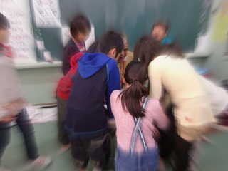 休憩時間。 点字カレンダーを持ってきた子が Kさんに読んでもらっています。みんなも興味津々! |